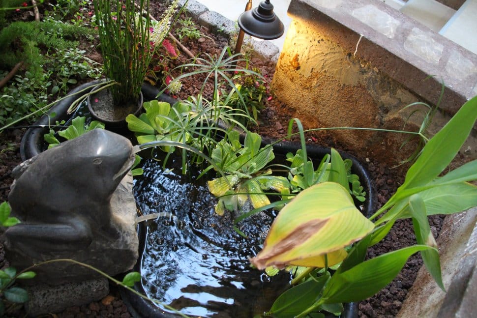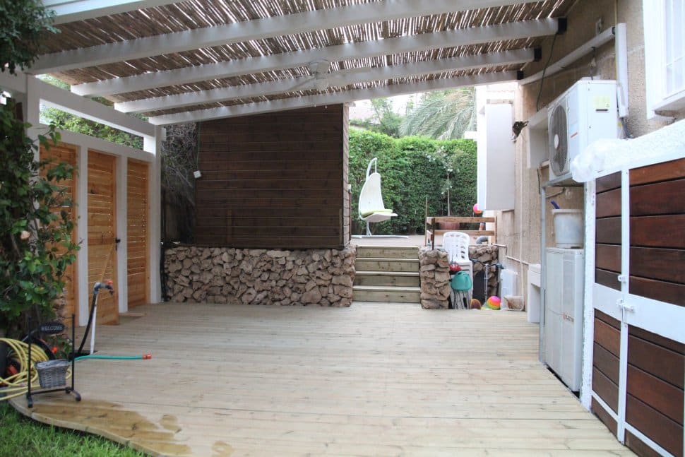 בנינו דק וחיפינו בפרגולה, הוספנו צמחיה צבעונית , החלפנו את שביל הגישה בשביל מבוסס על אבן חלילה, עם חיפוי של אבן בזלת מחוררת (אותה האבן שהשתמשנו גם ליצירת תאי הגן מתחת לחלון) ואלמנט מים מקסים של צפרדע היורקת מים לתוך בריכת נוי.